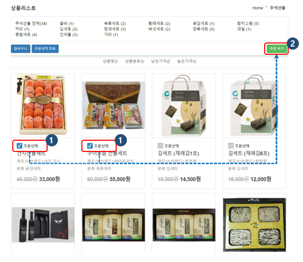 - - 장바구니 상품을 주문하기위해 [주문하기] 버튼을 클릭해 주문화면으로 이동