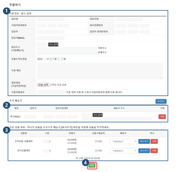 - - 상품도착요청일, 사업자등록증 사본 입력