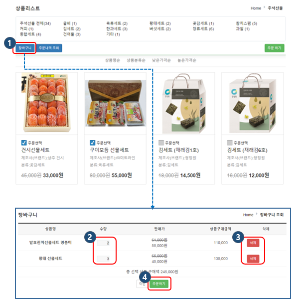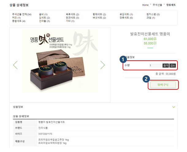 - - 수량 입력 후 [장바구니] 버튼 클릭