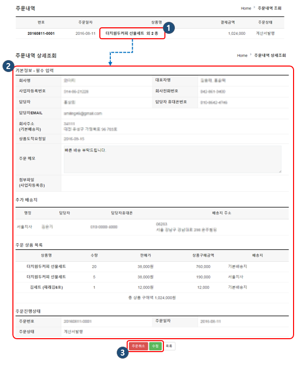 - - 주문내역을 수정하고 싶을 경우 [수정] 버튼을 클릭하여 주문 수정화면으로 이동