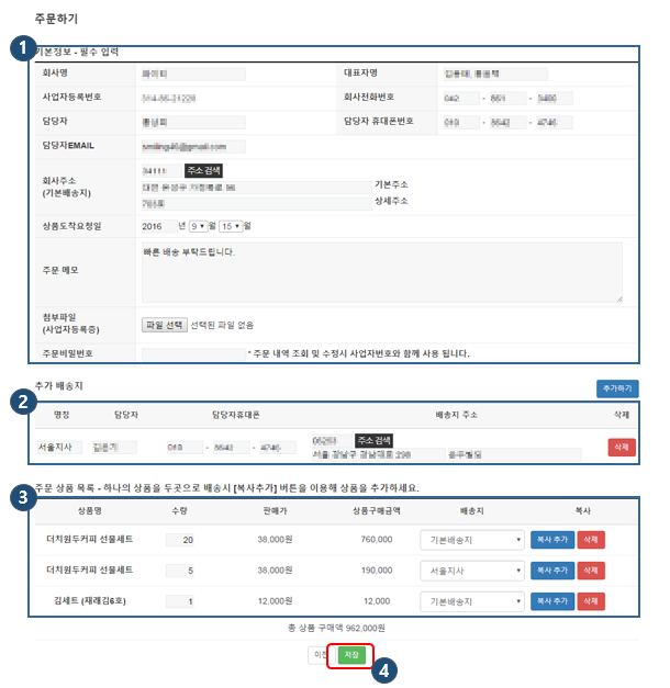 - - 주문정보 모두 입려 후 [저장] 버튼을 클릭해 저장