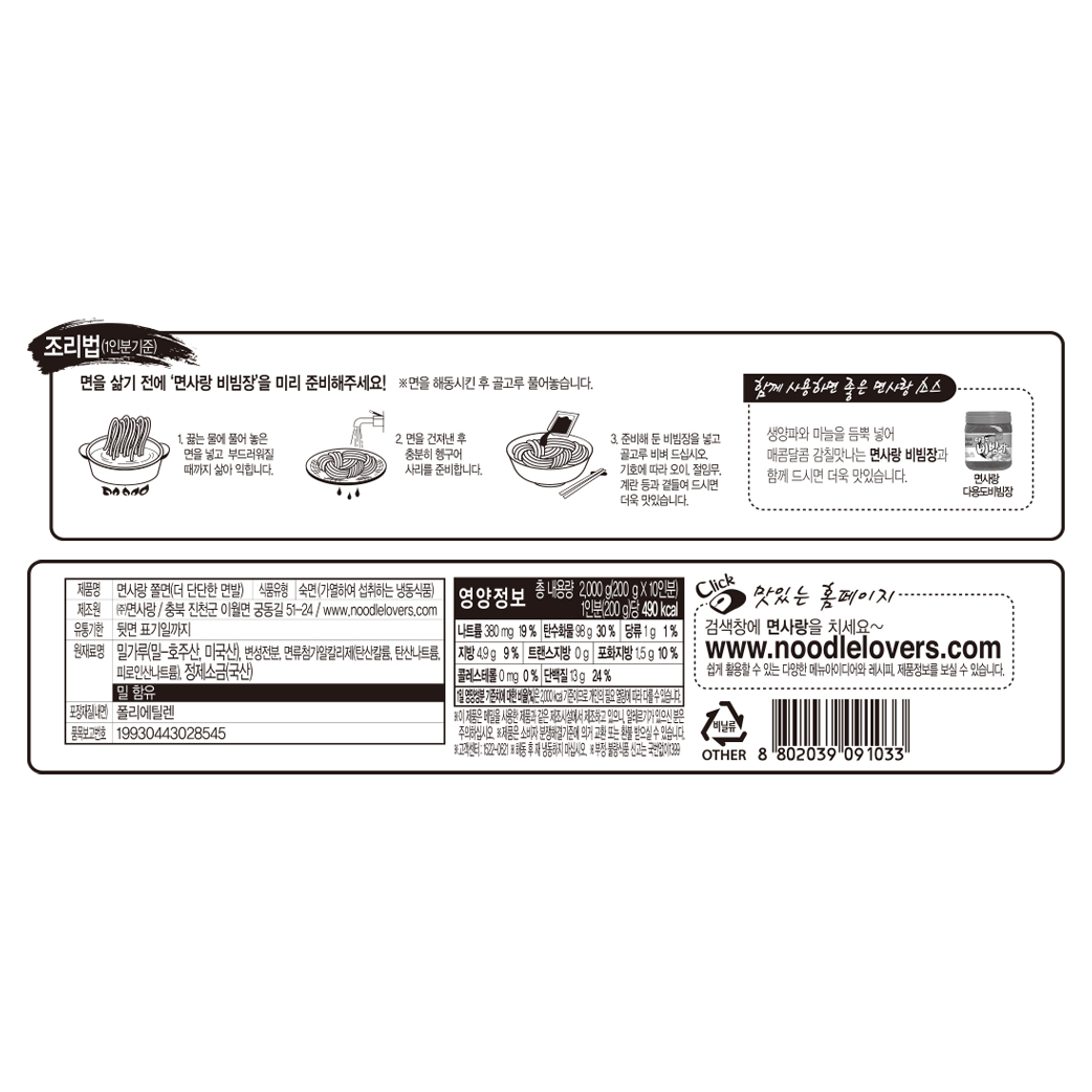 | 상품명 | 쫄면사리(면사랑.냉동.2kg) | 식품유형 | 상세설명참조 |