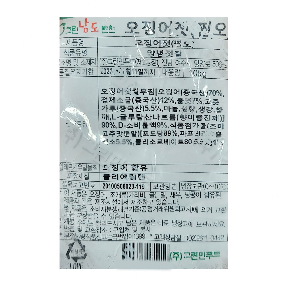 | 상품명 | 오징어젓(그린(찐오),10kg) | 식품유형 | 상세설명참조 |
