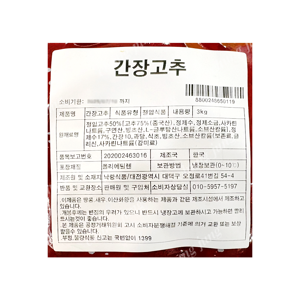 | 상품명 | 간장고추(낙랑,3kg,국내제조) | 식품유형 | 상세설명참조 |