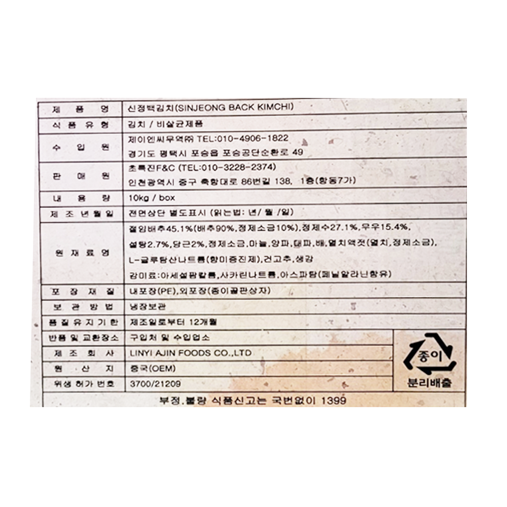 | 상품명 | SM/김치(백,신정,10kg,중국산) | 식품유형 | 상세설명참조 |
