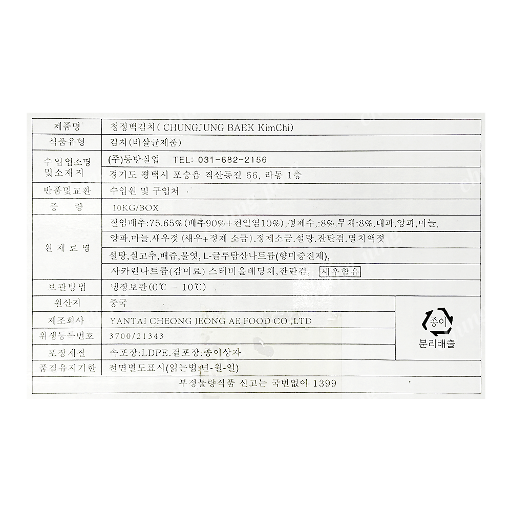| 상품명 | 백김치(청정,10kg,중국산) | 식품유형 | 상세설명참조 |