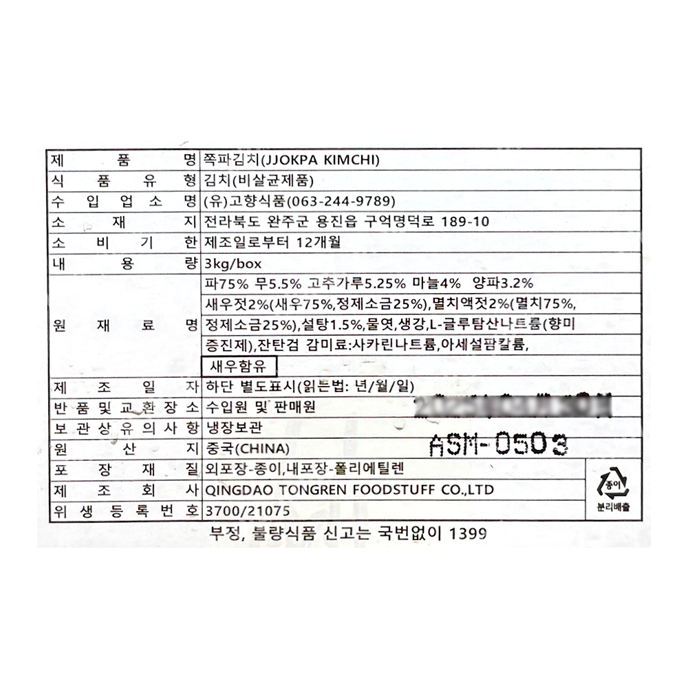 | 상품명 | 김치(쪽파,고향,중국산,3kg) | 식품유형 | 상세설명참조 |