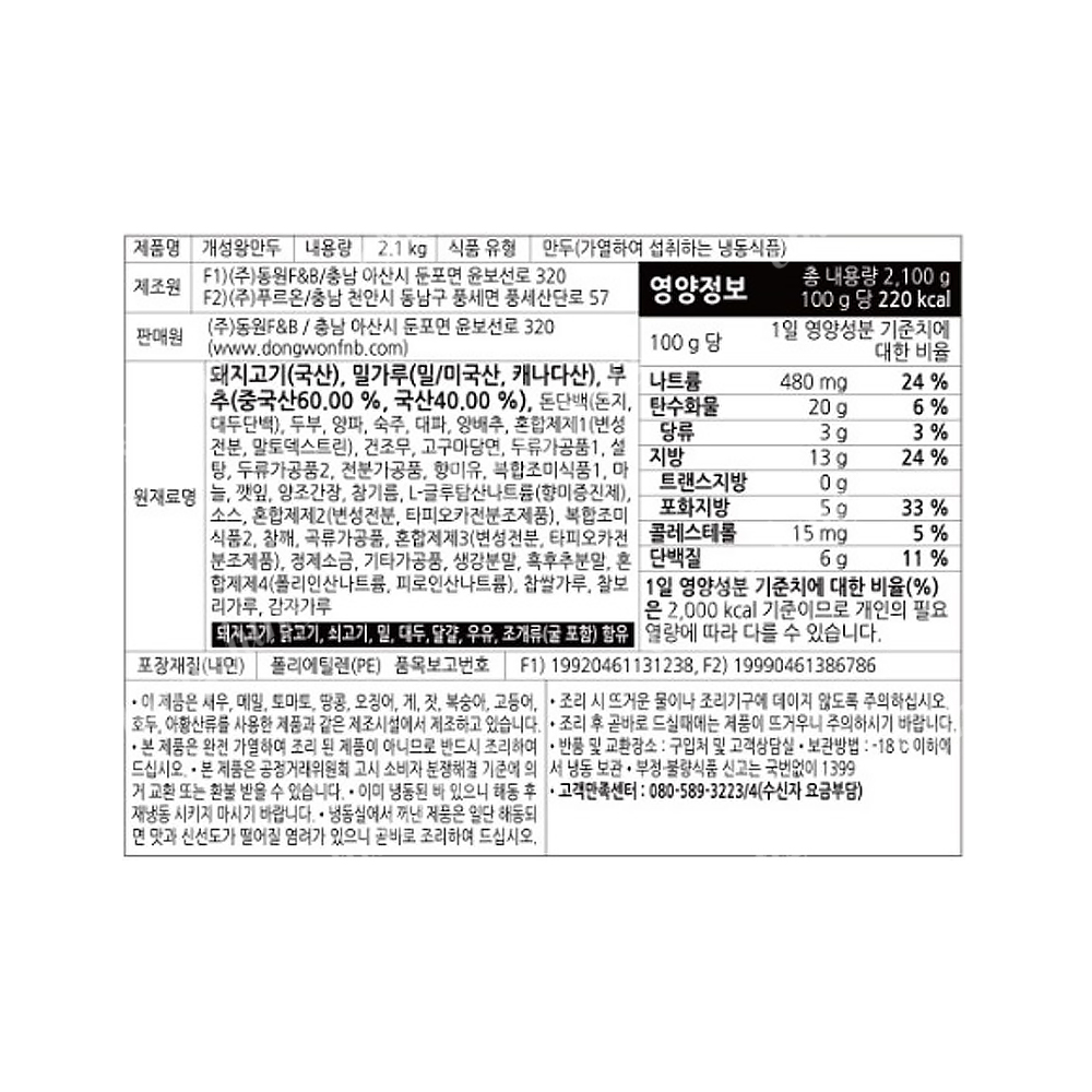 | 상품명 | 만두(왕,개성,2.1kg) | 식품유형 | 상세설명참조 |