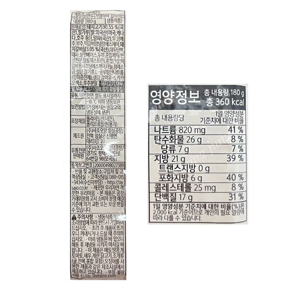 | 상품명 | 만두(갈비,오양,180g) | 식품유형 | 상세설명참조 |