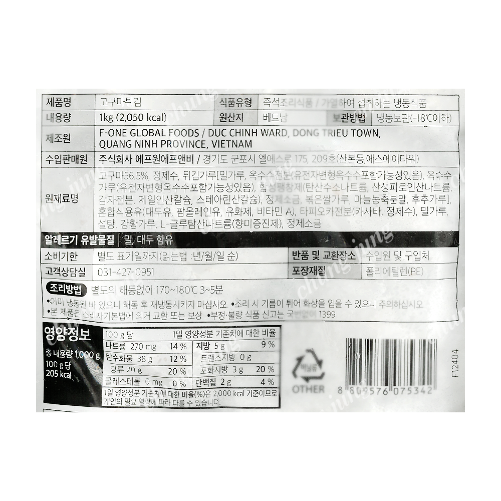 | 상품명 | 고구마튀김(대상,1kg) | 식품유형 | 상세설명참조 |