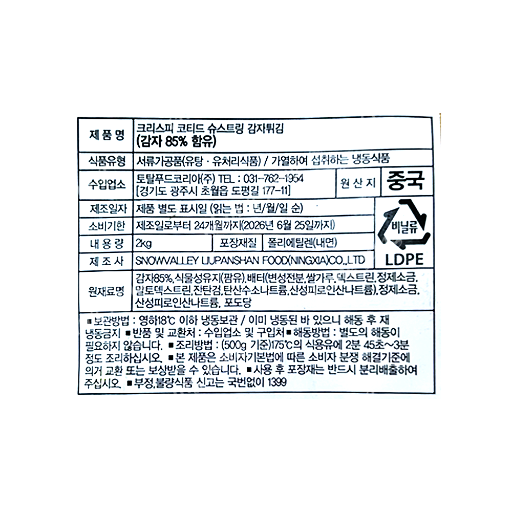 | 상품명 | 냉동감자(크리스피코티드슈스트링,마이디벨,2kg) | 식품유형 | 상세설명참조 |