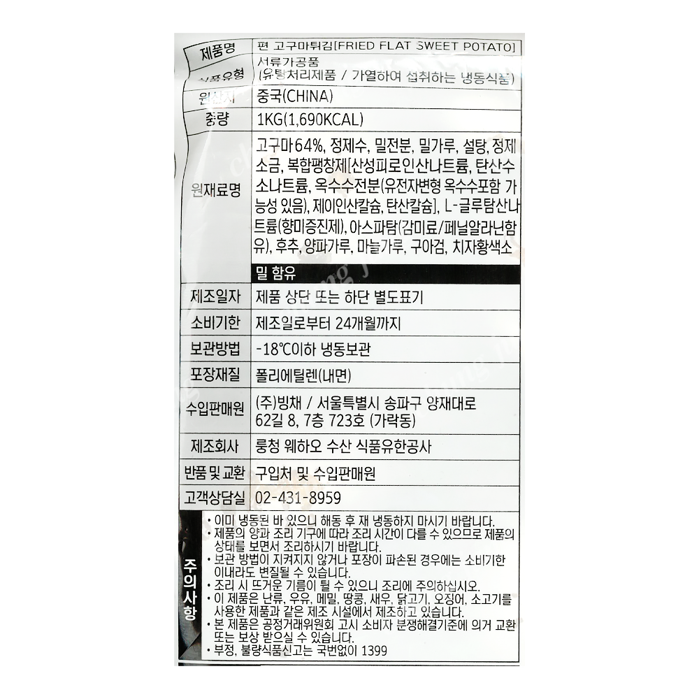| 상품명 | 고구마튀김(편,농우,1kg) | 식품유형 | 상세설명참조 |