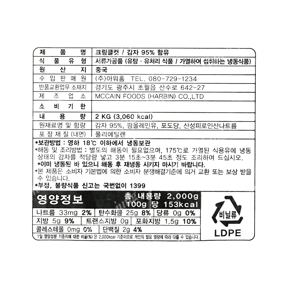 | 상품명 | 냉동감자(오지날초이스,클링클컷,맥케인,2kg) | 식품유형 | 상세설명참조 |