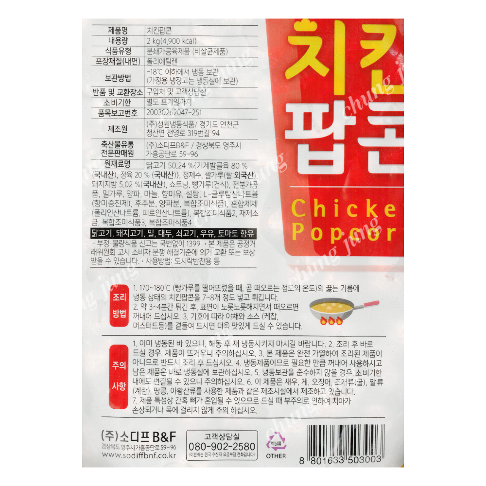 | 상품명 | 치킨팝콘(소디프,2kg) | 식품유형 | 상세설명참조 |