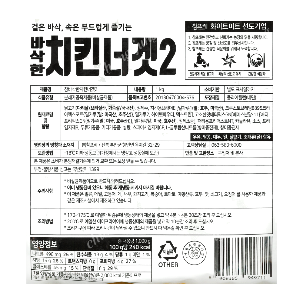 | 상품명 | 치킨너겟(바삭한치킨너겟2,참프레,1kg) | 식품유형 | 상세설명참조 |