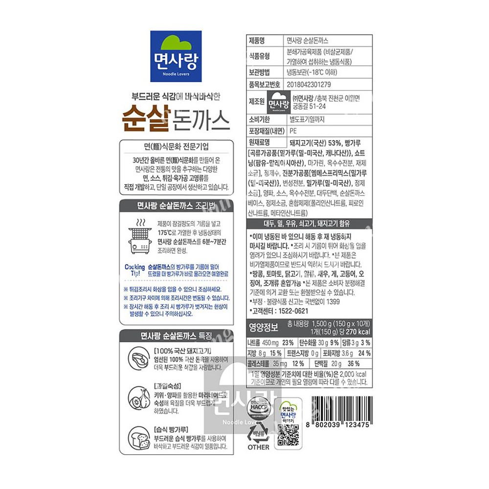 | 상품명 | 돈까스(순살,면사랑,150g*10입) | 식품유형 | 상세설명참조 |