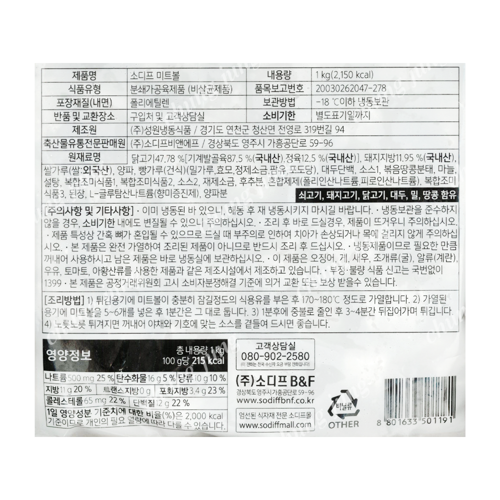| 상품명 | 미트볼(소디프,1kg) | 식품유형 | 상세설명참조 |