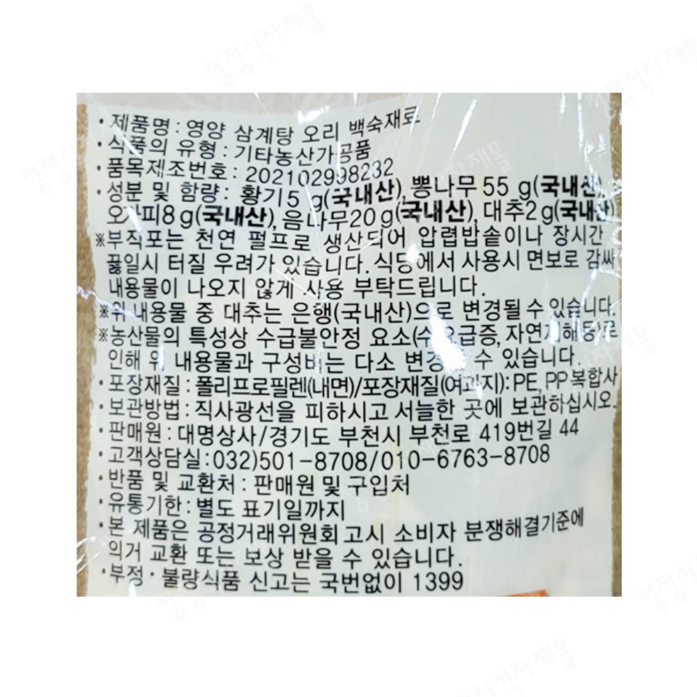 | 상품명 | 삼계탕재료(영양,오리,닭백숙,90g) | 식품유형 | 상세설명참조 |