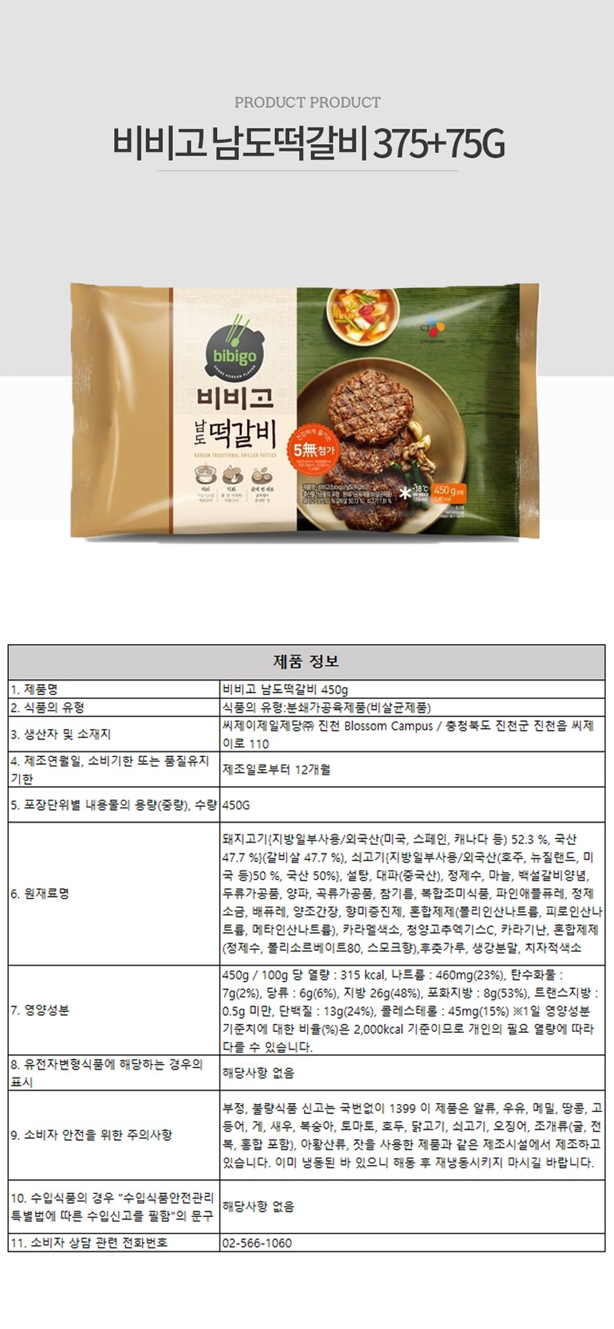 | 상품명 | 떡갈비(남도,비비고,375g+75g) | 식품유형 | 상세설명참조 |