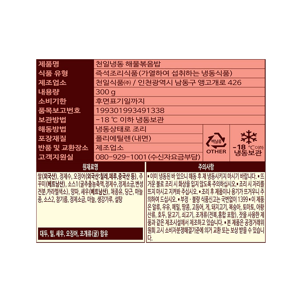 | 상품명 | 볶음밥(해물,천일,300g) | 식품유형 | 상세설명참조 |
