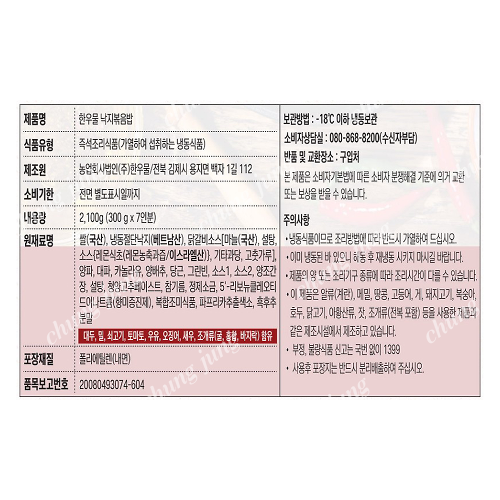 | 상품명 | 볶음밥(낙지,한우물,300g*7입) | 식품유형 | 상세설명참조 |