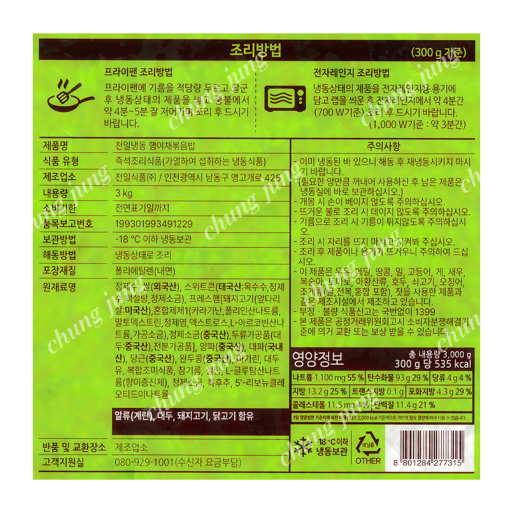 | 상품명 | 볶음밥(햄야채N,천일,3kg) | 식품유형 | 상세설명참조 |