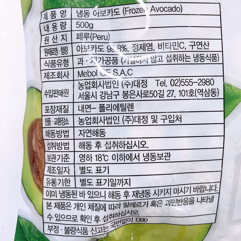 | 상품명 | 냉동과일(아보카도,500g,페루,대정) | 식품유형 | 상세설명참조 |