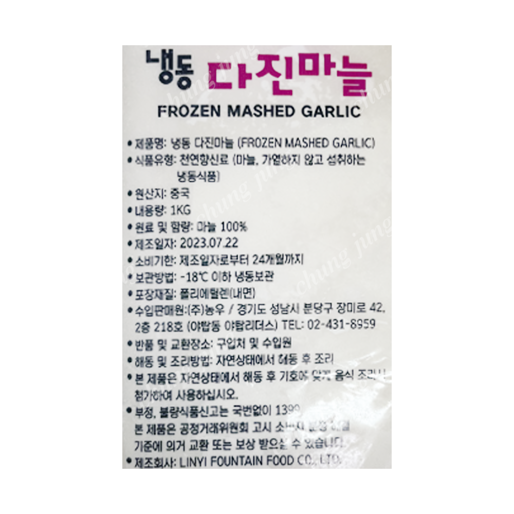 | 상품명 | 다진마늘(농우,냉동,1kg,중국산) | 식품유형 | 상세설명참조 |