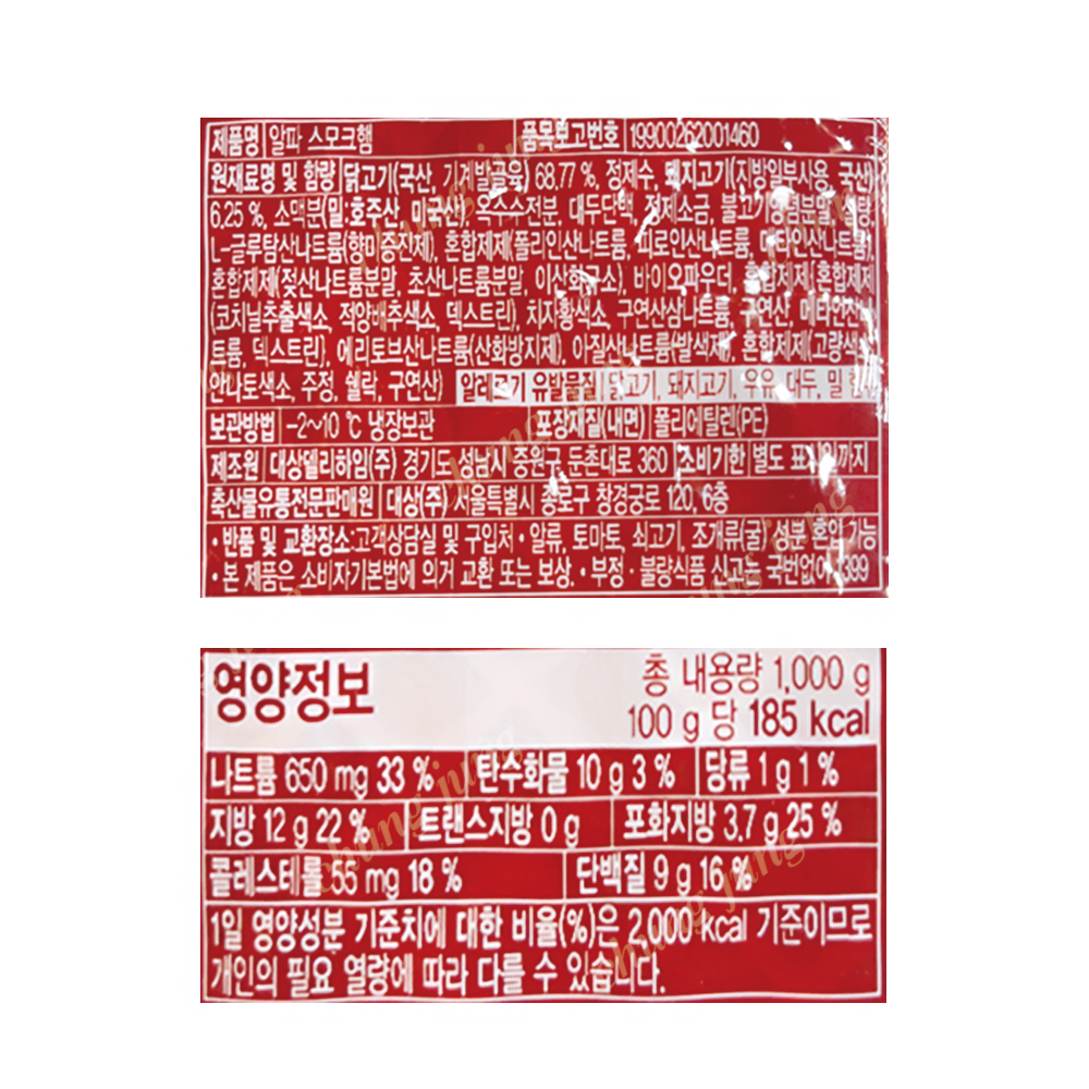 | 상품명 | 햄(알파스모크,쉐프원,1kg) | 식품유형 | 상세설명참조 |