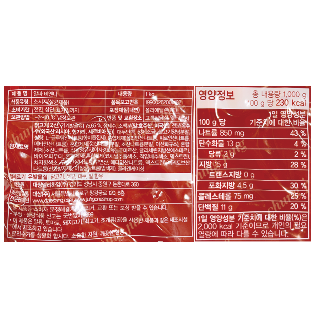 | 상품명 | 비엔나(알파,쉐프원,1kg) | 식품유형 | 상세설명참조 |