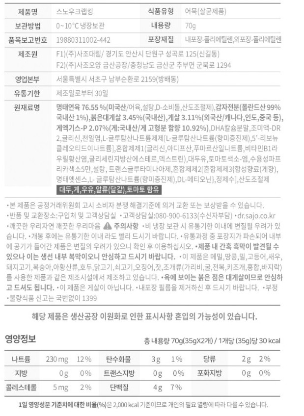 | 상품명 | 맛살(스노우크랩킹,대림,70g) | 식품유형 | 상세설명참조 |