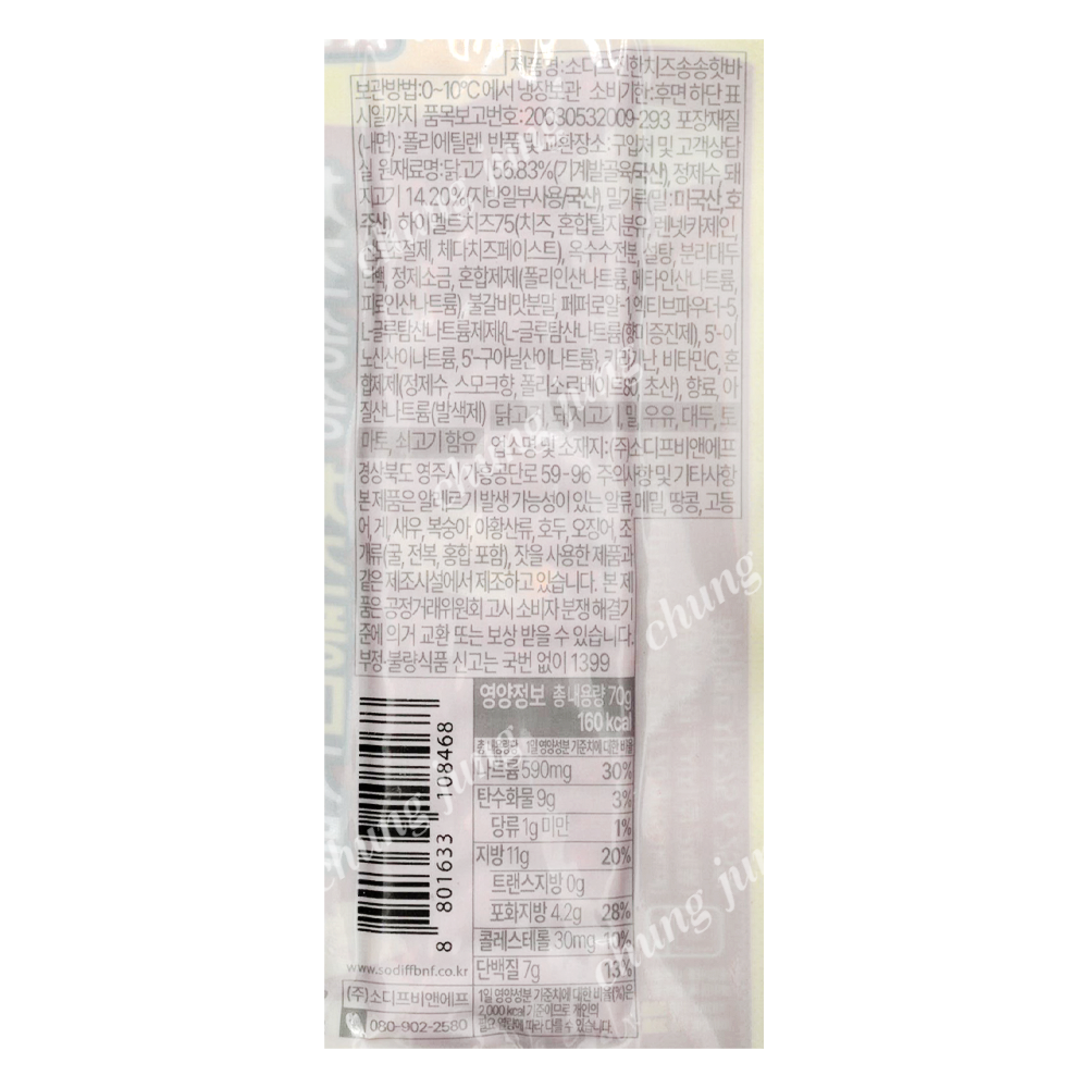 | 상품명 | 핫바(진한치즈송송,소디프,70g) | 식품유형 | 상세설명참조 |