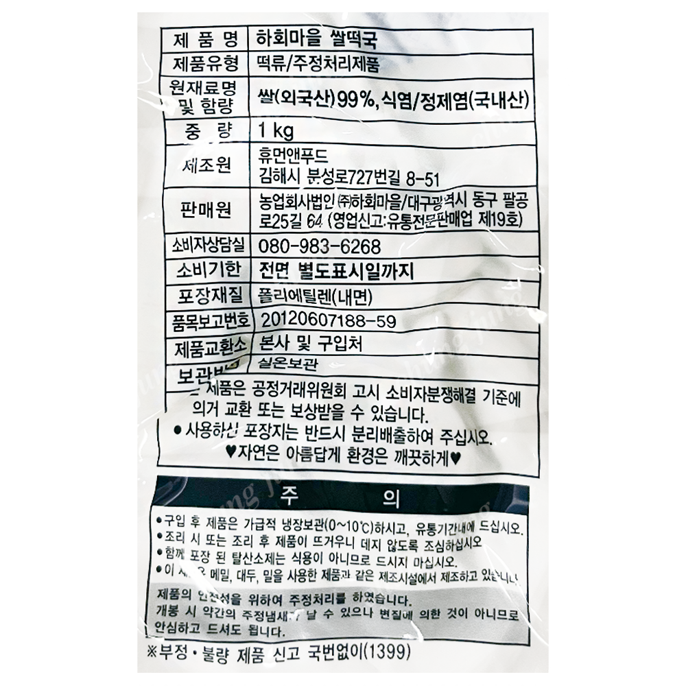 | 상품명 | HJ/떡국떡(쌀,화회마을,1kg) | 식품유형 | 상세설명참조 |