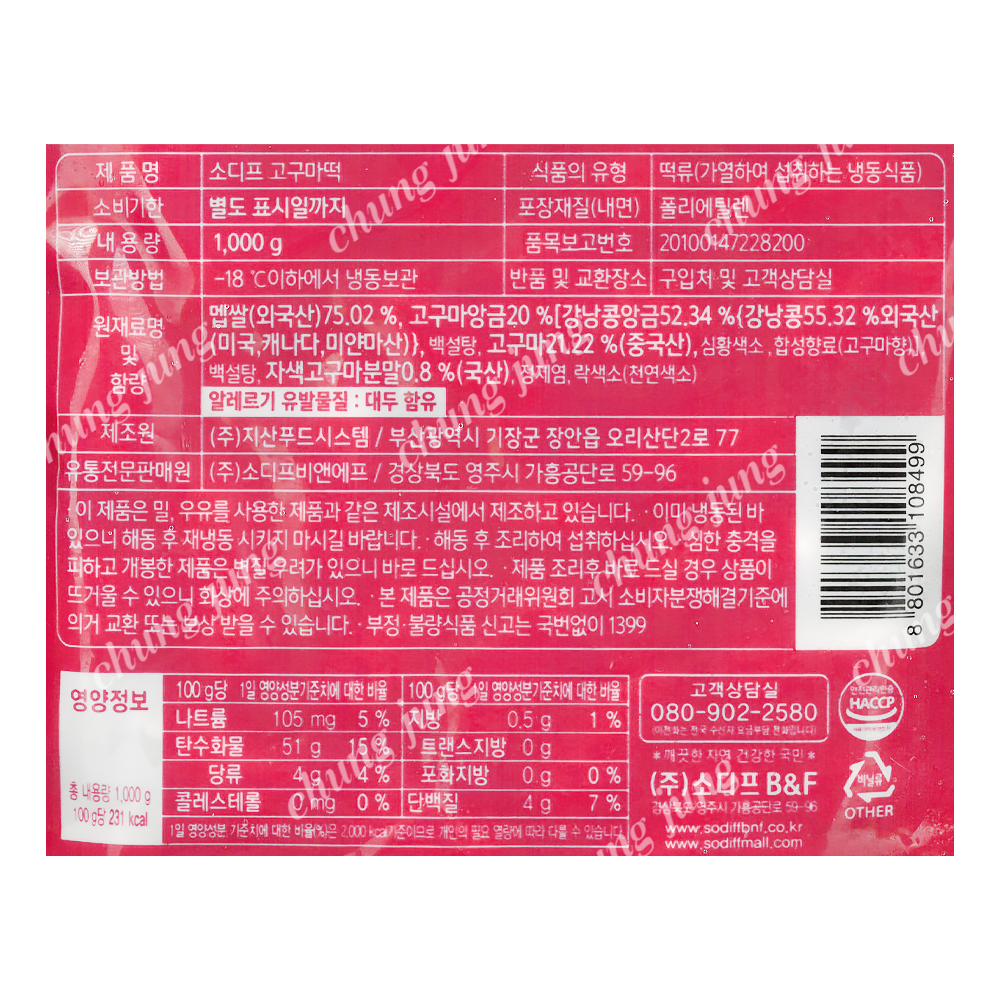 | 상품명 | 냉동떡(고구마,소디프,1kg) | 식품유형 | 상세설명참조 |