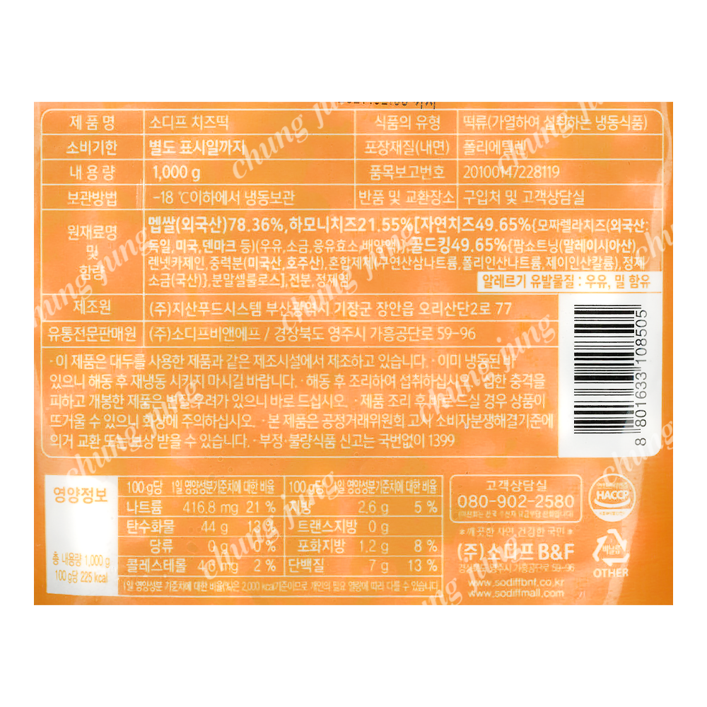 | 상품명 | 냉동떡(치즈,소디프,1kg) | 식품유형 | 상세설명참조 |