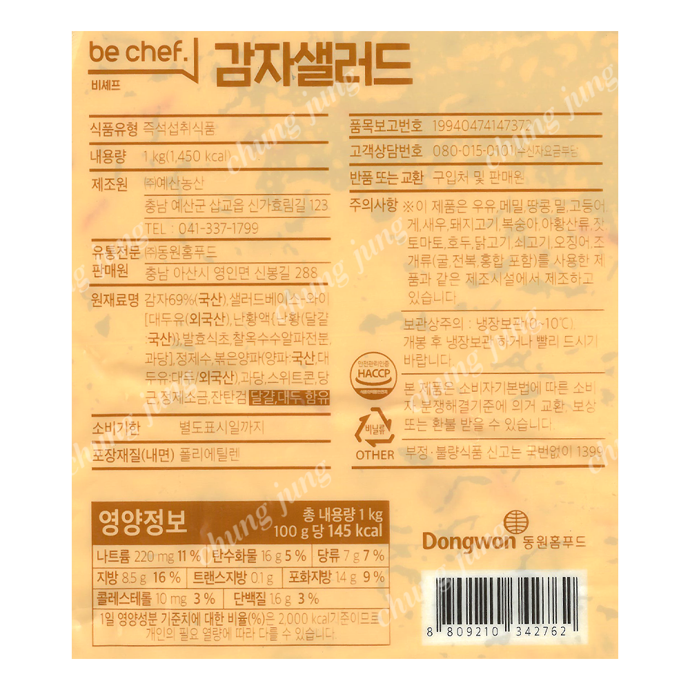 | 상품명 | 샐러드(감자,동원홈,1kg) | 식품유형 | 상세설명참조 |