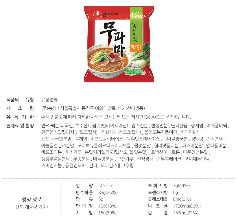 | 상품명 | 라면(사천짜파게티,농심,137g*4입) | 식품유형 | 상세설명참조 |