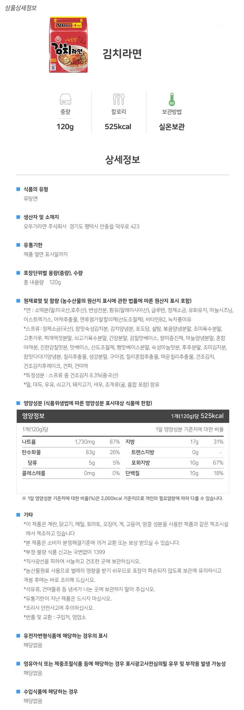 | 상품명 | 라면(김치라면,오뚜기,4입) | 식품유형 | 상세설명참조 |