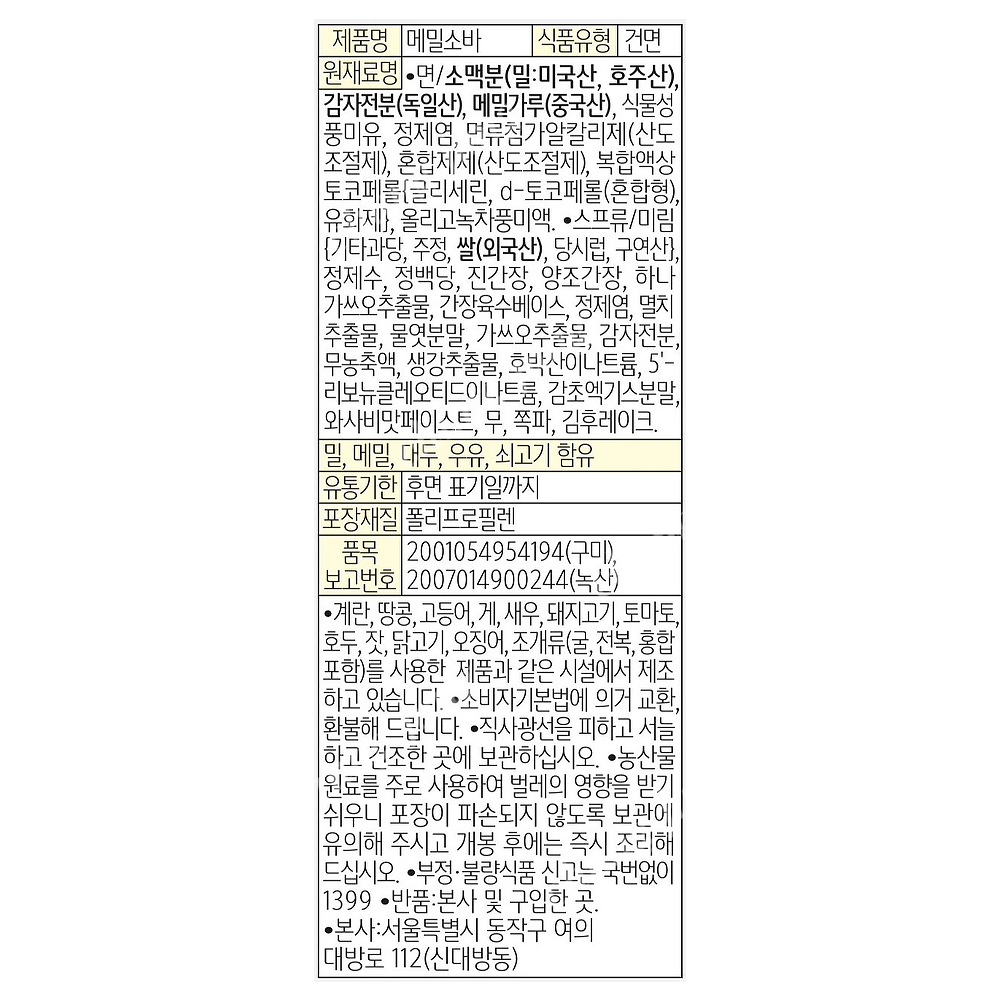 | 상품명 | 라면(메밀소바,농심,127g*5입) | 식품유형 | 상세설명참조 |