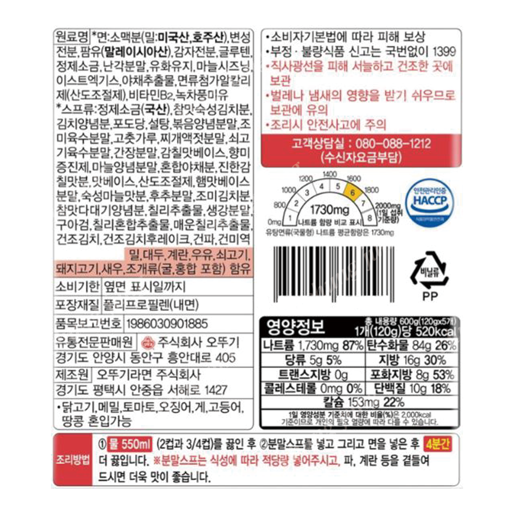 | 상품명 | 라면(김치,오뚜기,120g*5입) | 식품유형 | 상세설명참조 |