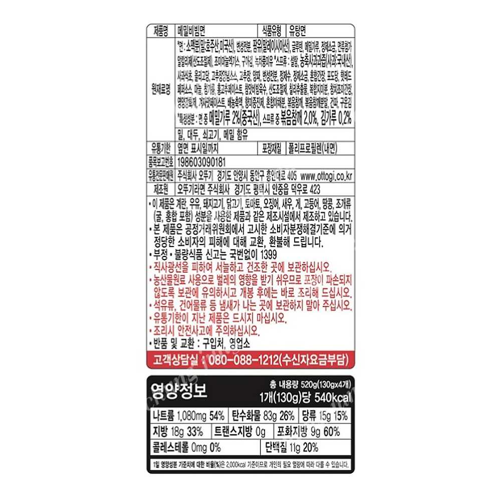 | 상품명 | 라면(메밀비빔면,오뚜기,130g*4입) | 식품유형 | 상세설명참조 |