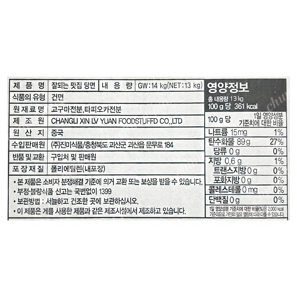 | 상품명 | 당면(잘되는맛집,진미,14kg) | 식품유형 | 상세설명참조 |