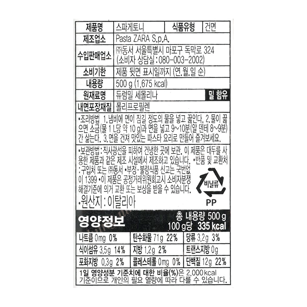 | 상품명 | 스파게티면(스파게토니,자라,500g) | 식품유형 | 상세설명참조 |