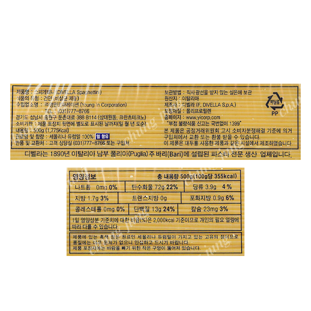 | 상품명 | 스파게티면(디벨라,9번,500g) | 식품유형 | 상세설명참조 |