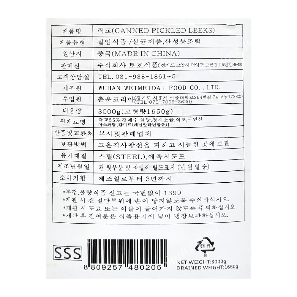 | 상품명 | 락교(토호,3S,3kg) | 식품유형 | 상세설명참조 |