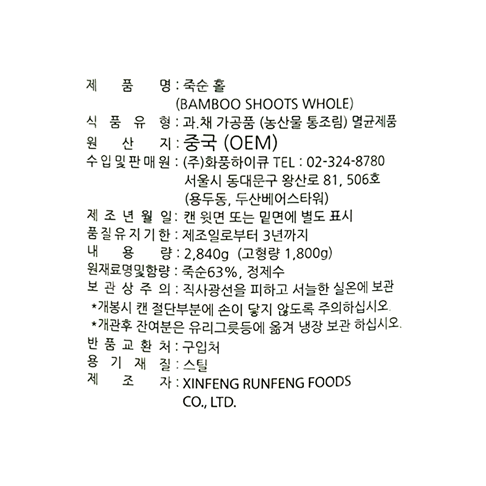 | 상품명 | 죽순(홀,화풍,2.84kg) | 식품유형 | 상세설명참조 |