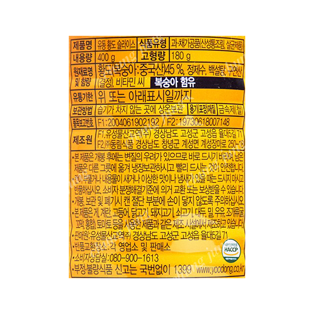| 상품명 | 황도(슬,유동,400g) | 식품유형 | 상세설명참조 |
