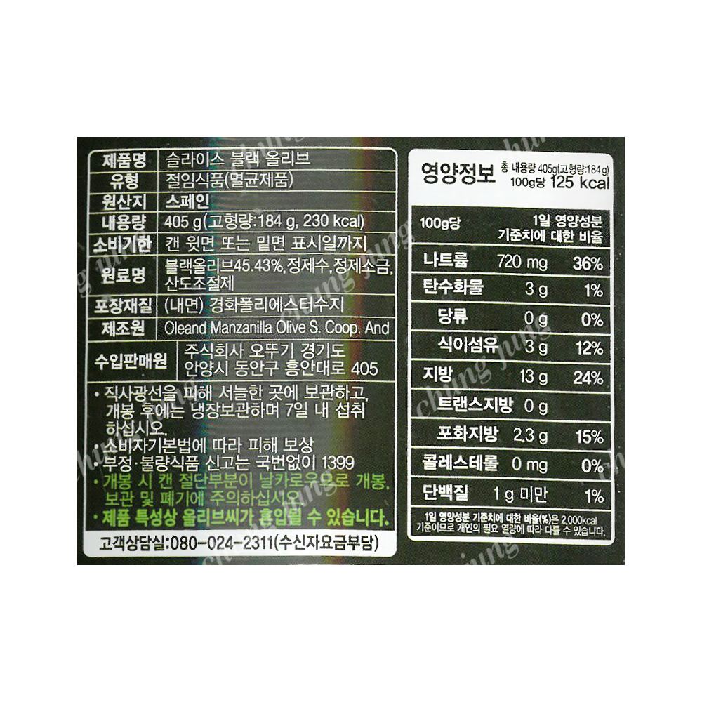 | 상품명 | 올리브(블랙,슬라이스,만자니아,405g) | 식품유형 | 상세설명참조 |