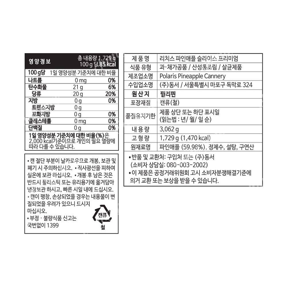 | 상품명 | 파인애플(슬(프리미엄),리치스,동서,3.062kg) | 식품유형 | 상세설명참조 |