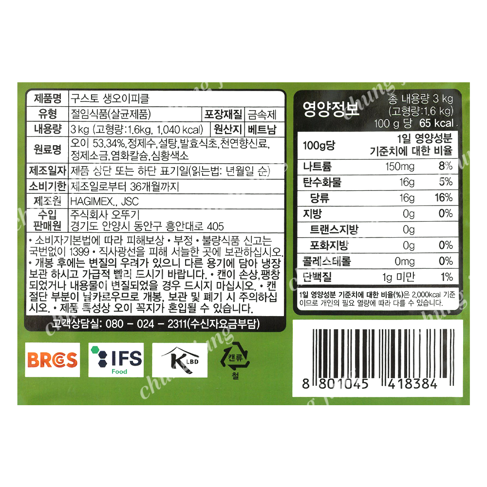 | 상품명 | 오이피클(구스토,오뚜기,3kg) | 식품유형 | 상세설명참조 |